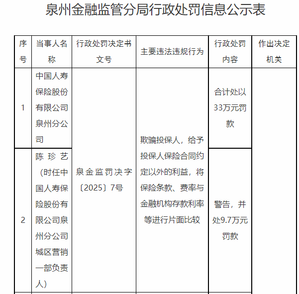 中国经济网北京11月26日电 泉州市金融监管局《行政处罚信息公示表》(泉金监行决字[2025]号)将保险条款、费率与金融机构存款利率进行片面比较,被泉州市金融监管局罚款共计33万元。泉州市金融监管局行政处罚信息公示表(泉金监分决字[2025]号)被警告并罚款97000元。郑志荣(时任中国人寿保险股份有限公司华县分公司营销服务二部负责人)被警告并罚款11000元。金检防检字[2025]9号显示,中国人寿保险股份有限公司南安分公司财务数据虚假,被泉州市金融监管局罚款18万元。戴培坤(时任中国人寿保险股份有限公司南安分公司银行保险部经理)被警告,并罚款3万元。全金剑峰审字[2025]10号显示,中国人寿保险股份有限公司永春县分公司财务数据虚假,被泉州市金融监管局扣押11万元。对中国人寿保险股份有限公司永春县分公司经理郑世荣给予警告,并罚款13000元。全金检防决字[2025]11号显示,中国人寿保险股份有限公司泉州市泉港区分公司因合同外保单出具MGA保单,被泉州市金融监管局处罚14万元。潘金变(时任泉州市泉港区分公司副经理)中国人寿保险股份有限公司(以下简称“中国人寿保险股份有限公司”)被警告并罚款4.5万元。全金检风决字[2025]12号显示,中国人寿保险股份有限公司南安分公司营销服务二部财务数据虚假,被泉州市金融监管局扣押12万元。对刘建峰(时任中国人寿保险股份有限公司南安分公司营销发展部经理)给予警告,并罚款16000元。