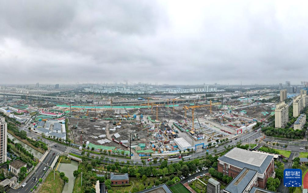 这是10月16日拍摄的正在建设中的上海宝山站(无人机照片)。目前,中国铁路上海工程局实施的上海宝山站建设项目正在全面加快推进。上海宝山站是国家“八纵八横”高铁网沪渝渝沪通铁路的重要枢纽。设计列车日均进出旅客14.8万人次。新华社记者 方哲 摄