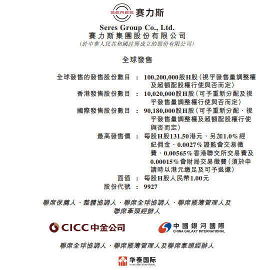 中国经济网北京10月27日讯:大力士(601127.sh)A股今日破势下跌0.61%,收于159.03元。今日上证综指收涨1.18%,深成指收涨1.51%,创业板指收涨1.98%。大力士今天上午向香港联交所发布的公告显示,公司股票预计将于2025年11月5日(周三)开始在联交所挂牌交易。公司股票以每手 100 股 H 股在主板上市交易,H 股股票代码为 9927。大力士香港股最高发行价为每股 H 股 131.50 港元,含 1.0%经纪佣金、0.0027%证券及期货事务监察委员会交易征费、0.00565%香港联交所费用及 0.00015%财务费用局征征勒vy Levy Levy Levy Levy(必须于申请时以港元全额缴付并退还)。公司全球发售的H股数量为100,200,000股H股(须行使数量调整权及超额配售选择权),其中香港发售的H股数量为10,020,000股。股份(可予重新分配,并须待发售数量调整后使用),国际发售股份数量为 90,180,000 股 H 股(可予重新分配,须待发售数量调整后使用及超额配股权)。此外,与全球发售相关,公司预计将向国际承销商提供超额配股权,可供总协调人(代表其本人并代表国际承销商)使用。根据超额配售选择权,国际承销商将有权(行使总协调人(代表其本人及代表国际承销商)可于上市日期起至提交香港公开发售申请截止日期后30日内的任何时间要求本公司发行全球发售总额。可供认购的发售股份数量将不超过15.0%(假设数量调整权未全部行使),或合计最多为17,284,500股H股,占本次全球发售可供认购股数的15.0%(假设数量调整权全部行使),以实现超额配售(若为全球发售。根据 上海证券报·中国证券网,以每股最高发行价格131.50港元为基础,假设不进行数量发行中的配股权调整及超额配售,预计所得款项净额为129.249亿港元,将用于研发投资、各种营销渠道的投资、各种销售以及收费网络服务,这仍然有利于工作和一般及一般和收费网络、企业用途。大力士的联席保荐人、总协调人、联席全球协调人、联席账簿管理人及联席管理人为中金公司、中国银河国际,联席全球协调人、联席账簿管理人及联席牵头经办人为华泰国际。